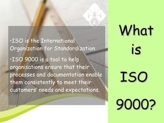 ISO 9000 is an international standard for quality management systems that helps organizations ensure they meet customer and regulatory requirements. It originated in the UK in 1947 and has been adopted by over 50,000 companies worldwide. Implementing ISO 9000 involves documenting processes, ensuring standard operating procedures are followed, monitoring effectiveness, and identifying improvements. Certification generally takes 6-9 months and costs between £1500-£2600 initially and £1400 annually for ongoing audits. Benefits include improved profits, customer satisfaction, and ability to enter global markets.