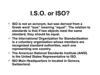 ISO, derived from the Greek word 'isos' meaning 'equal', is a voluntary organization that creates international standards and is supported by national standard authorities from member countries. Founded to enhance product quality, safety, and compatibility, ISO standards facilitate global trade and improve organizational efficiency. The ISO 9000 series, including ISO 9001, outlines quality management frameworks to ensure consistent product and service quality across various sectors.