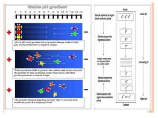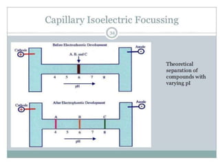 This document provides an overview of isoelectric focusing (IEF). IEF separates proteins in a gel according to their isoelectric point (pI), which is the pH at which a protein has no net charge. During IEF, proteins migrate through an immobilized pH gradient generated by ampholytes until they reach the pH that matches their pI and cease moving. IEF provides high resolution separation and is useful for research applications such as taxonomy, cytology, and immunology.