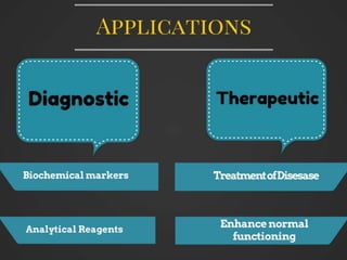 This document discusses various applications of enzymes in diagnostics, therapeutics, and analytical testing. It provides examples of enzymes used as diagnostic markers for conditions like myocardial infarction. It also outlines some therapeutic uses of enzymes like streptokinase to break up blood clots and asparaginase in cancer treatment. Finally, it notes analytical applications of enzymes in techniques like ELISA and uses in industries like food production and DNA analysis.