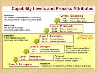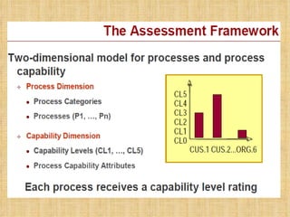 ISO/IEC 15504, also known as SPICE, is an international standard for software process assessment. It defines a framework for assessing processes based on a process reference model and capability levels. Processes are divided into categories and each process is assessed against attributes to determine its capability level on a scale of 0 to 5. ISO/IEC 15504 provides guidelines for conducting assessments through steps like planning, data collection, and reporting results. Assessors require training and experience to perform assessments competently. The standard can be used for both process improvement and determining a supplier's process capabilities.