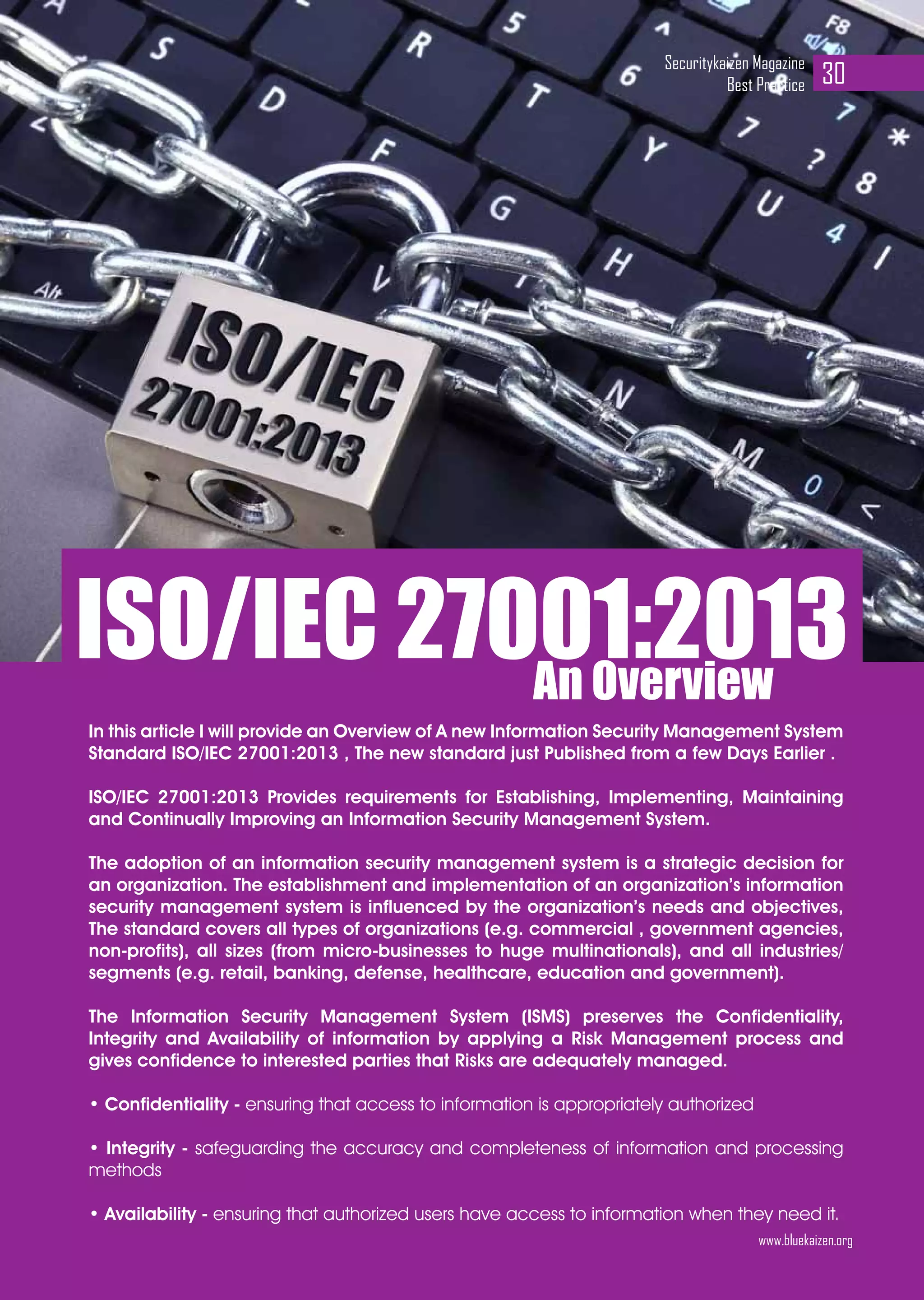 This article provides an overview of the newly published information security management system standard ISO/IEC 27001:2013, detailing its requirements for establishing and maintaining an ISMS across various organizations. The standard emphasizes the importance of preserving information confidentiality, integrity, and availability through risk management while also outlining the certification process and associated benefits. The document summarizes the history, structure, and implementation timeline of ISO/IEC 27001:2013 and its relationship with other ISO standards.