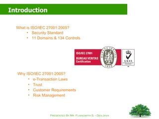 ISO/IEC 27001:2005 is an international standard for information security management. It defines 11 domains and 134 controls for organizations to manage risks to security. The standard covers policies, procedures, and controls for asset management, human resources, physical security, communications, access control, systems development, incident response, business continuity, and compliance. Certification to ISO 27001 helps organizations assure customers and meet legal requirements by implementing an information security management system.