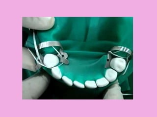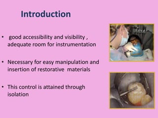 This document discusses methods of isolation in dentistry. Direct isolation methods include rubber dams, cotton rolls, cellulose wafers, Dri-angles, gauze, suction devices, and retraction cords. The rubber dam provides the best isolation and was introduced in 1864. It isolates teeth from oral fluids to create a dry field. Advantages include a clean operating field, improved access and visibility, soft tissue retraction and protection, and reduced cross-contamination. Application and removal of the rubber dam is described in 20 steps. Other isolation methods like cotton rolls provide some retraction but do not create as dry a field as the rubber dam.