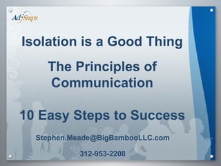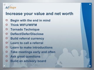 The document provides 10 steps for success in the entertainment industry: 1) Begin with the end in mind, 2) Consider what's in it for you and others, 3) Use the "Tornado Technique" to concisely pitch your value, 4) Deflect, defer, and disclose questions, 5) Build referral currency, 6) Learn to make introductions, 7) Learn to call referrals, 8) Take early meetings, 9) Ask great questions, and 10) Build an advisory board with experienced individuals. Specific tips are given for each step, such as being specific about goals and contacts, redirecting questions, and creating value for advisors.