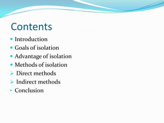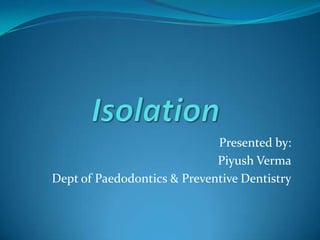 This document discusses isolation techniques in dentistry. It begins by outlining the goals of isolation, which include moisture control, retraction and access, harm prevention, and maintaining an aseptic operating field. Direct isolation methods like rubber dams and indirect methods like cotton rolls are described. The document focuses on rubber dams, outlining their advantages and how to properly select, place, and remove one. Key steps include punching holes, lubricating, choosing an appropriate clamp, and passing the dam through contacts. Potential errors in application and removal are also reviewed.