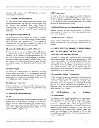 This study focused on the isolation, partial purification, and characterization of alkaline serine protease from Cucumis melo var. agrestis seeds, achieving a molecular weight of 54 kDa with optimal activity at pH 9.0 and 40°C. The enzyme was purified through a four-step process involving acetone fractionation, ammonium sulfate precipitation, ion-exchange chromatography, and gel filtration, ultimately exhibiting homogeneity and stability in its properties. Results indicate that the alkaline protease is a serine protease similar to cucumisin found in melon fruits.