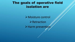 The document discusses isolation of the operative field during dental procedures. Several components must be controlled, including saliva, tongue, and soft tissues. Rubber dam provides the best isolation, allowing a dry, clean field and protecting tissues. Other isolation techniques and materials include cotton rolls, high-volume evacuators, cheek retractors, and air-water syringes. Proper isolation improves visibility, infection control, and material properties during restorative dental work.