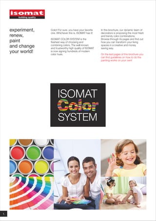 This brochure from ISOMAT proposes trendy color combinations for transforming living spaces in a creative and affordable way. It provides over a dozen color combination ideas with names like "Sunshine" featuring yellow hues and "Fruit Punch" pairing optimistic colors. Each combination displays the specific color shades. The brochure also offers tips for painting projects, highlighting ISOMAT's high-quality paint products.