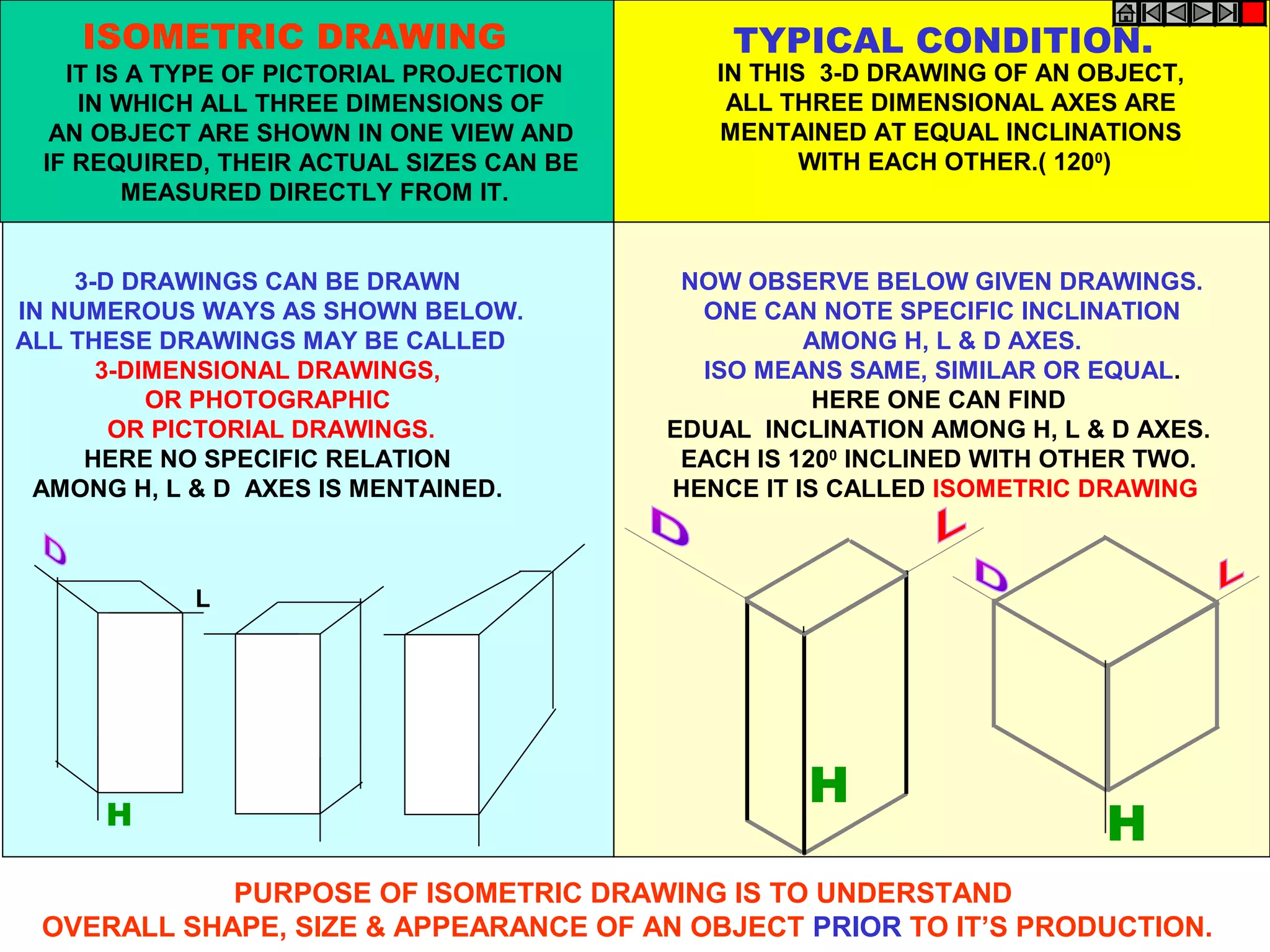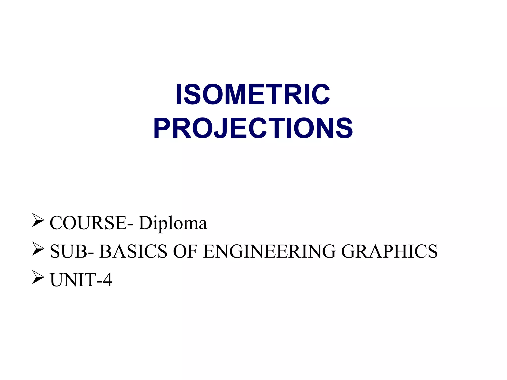 This document provides information about isometric projections and how to draw them. It defines key terms like isometric axes, lines, and planes. It explains that in isometric projections, all three dimensions are shown at equal inclinations of 120 degrees. It provides examples of how to draw isometric views of various objects like prisms, pyramids, cylinders, and their combinations. It also describes how to construct an isometric scale to accurately draw dimensions when creating isometric projections.