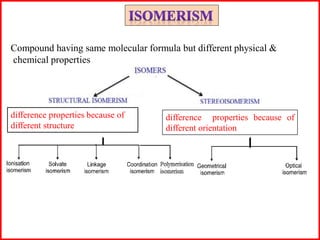 This document discusses different types of structural isomerism that can occur in coordination compounds. It defines structural isomerism as compounds having the same molecular formula but different physical and chemical properties due to different structures or orientations. The types of structural isomerism discussed include ionization isomerism, solvate/hydrate isomerism, linkage isomerism, coordination isomerism, ligand isomerism, polymerization isomerism, geometrical isomerism (cis/trans), and optical isomerism. Examples are provided to illustrate each type of isomerism.