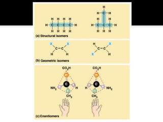 The document discusses three types of isomers: structural isomers, geometric isomers, and enantiomers. Structural isomers have the same molecular formula but different connectivity of atoms. Geometric isomers have the same molecular formula and connectivity but different spatial arrangements, usually due to double bonds or rings. Enantiomers are non-superimposable mirror images that contain a chiral carbon with four different groups attached.