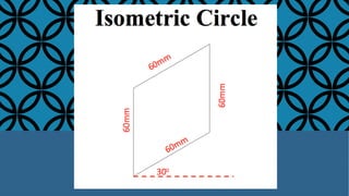 The document provides instructions for drawing an isometric circle in 6 steps: 1) Add center lines to a 60mm isometric square. 2) Draw lines from the wide corners to the opposite center lines. 3) Repeat for the other side. 4) The red lines will be radii for circles drawn toward the guidelines. 5) Repeat for the other side. 6) The isometric circle is now complete and can be drawn at different 30 degree angles.
