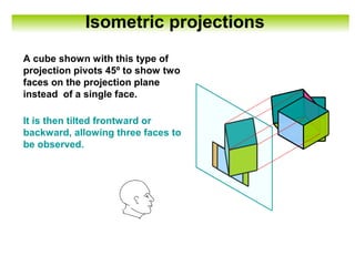 This document provides information on isometric projections and isometric drawing techniques. It discusses how isometric projections allow three faces of an object to be viewed at once by pivoting the object 45 degrees. It also describes how isometric drawings are created using a "box construction" method where measurement lines are drawn at 30 degree angles to form an outline box for the object. The stages of isometric drawing are outlined as sketching the box, measuring details, and final layout. Methods for drawing non-isometric lines, circles, and rounded objects in isometric perspective are also summarized.