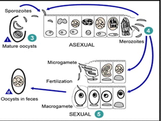 This document discusses coccidian protozoa, an obligate intestinal parasite found worldwide in subtropical and tropical regions. It has a complex life cycle involving both sexual and asexual reproduction. Symptoms in humans include diarrhea, abdominal pain, and weight loss. It is transmitted through the fecal-oral route due to ingestion of contaminated food or water in areas with poor sanitation. Diagnosis involves finding oocysts in stool samples under a microscope. Treatment involves antibiotics like trimethoprim/sulfamethoxazole. Prevention relies on proper sanitation and hygiene practices.