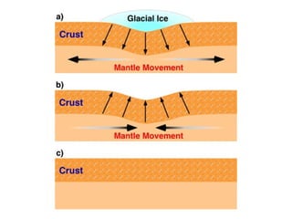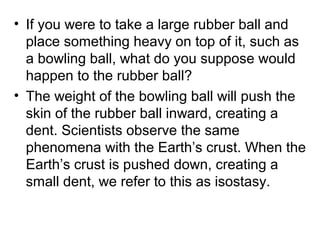 The document discusses the geological concept of isostasy. Isostasy refers to the principle of buoyancy where land masses float on the denser underlying mantle material. It explains that mountains create indentations in the earth's crust similar to placing a heavy object on a rubber ball. It also describes early theories on isostasy from Clarence Dutton, who coined the term, and Sir George Airy, who proposed that land masses float with varying thickness but uniform density. The concept was later refined by A. Pratt to propose uniform depth but varying density between land masses.