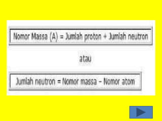 Dokumen ini membahas tentang isotop, isobar, dan isoton serta pentingnya memahami struktur atom dan sifat-sifat unsur. Nomor atom dan nomor massa menjadi ciri khas suatu unsur yang membantu dalam mengklasifikasikan elemen berdasarkan jumlah proton, neutron, dan elektron. Penjelasan juga mencakup cara menghitung massa atom relatif dari unsur berdasarkan isotop yang ada.