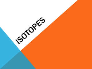 This document discusses isotopes and their properties. It defines isotopes as forms of the same element that have different numbers of neutrons but the same number of protons. It provides examples of carbon isotopes and explains that isotope notation specifies the element name or symbol followed by the mass number. Isotopes can be naturally occurring or artificially made, and they have various medical and dating uses. The document also includes questions to test the reader's understanding of isotopes.