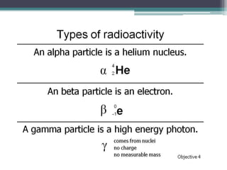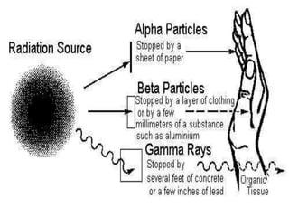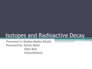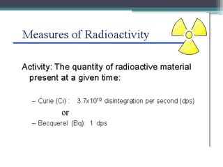 This document discusses isotopes and radioactive decay. It defines isotopes as forms of a chemical element with the same number of protons but different numbers of neutrons. It describes the history of discoveries in radioactivity by Henri Becquerel, Frederick Soddy, and Ernest Rutherford. It discusses the types of radioactive particles (alpha, beta, gamma rays), their properties, and how radioactive decay occurs. It also covers radioactive decay rates, units of radioactivity like curies, and the concept of half-life.