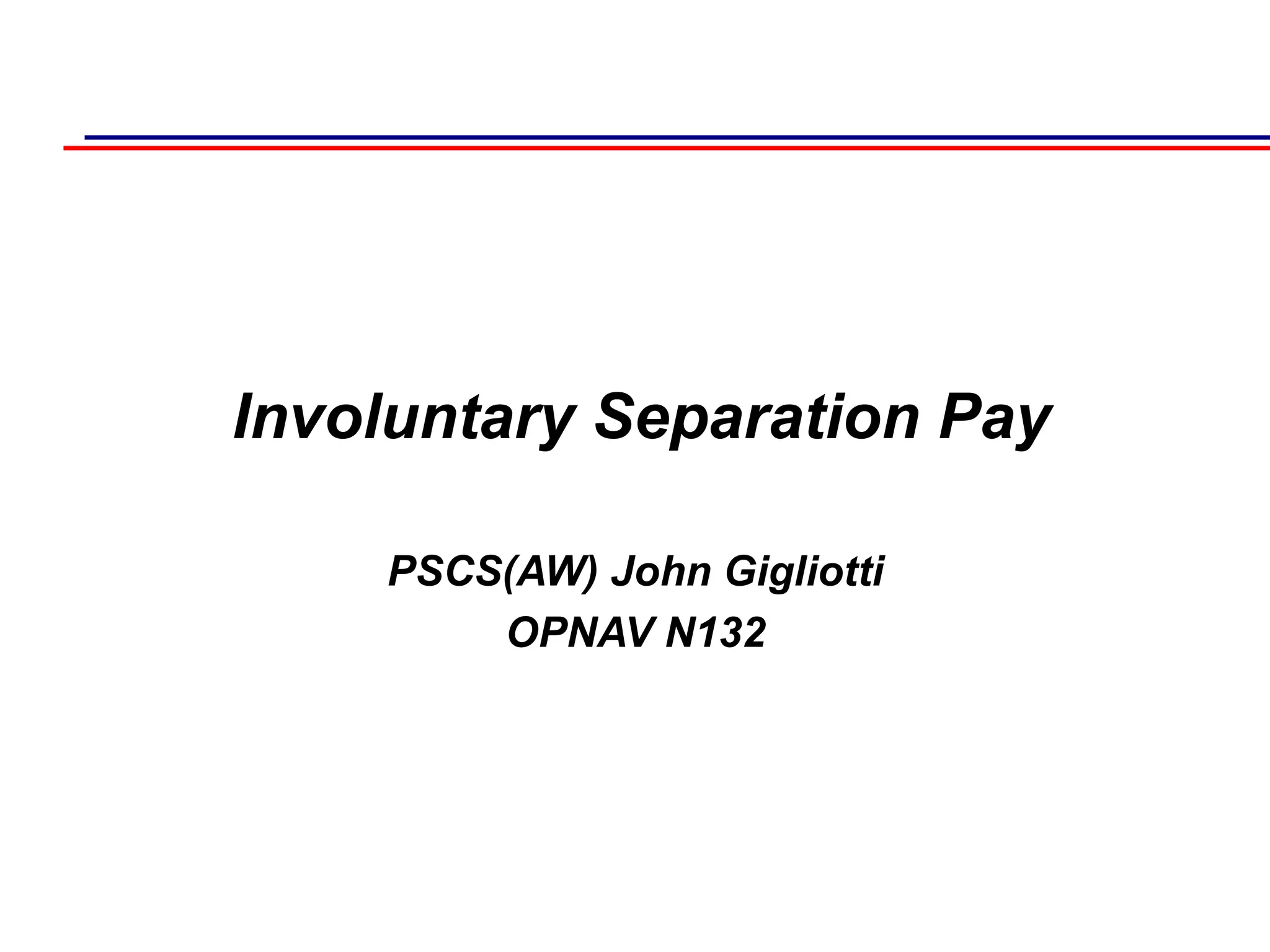 This document summarizes involuntary separation pay policies for the Navy. It defines involuntary separation and eligibility criteria, such as completing 6-20 years of service with an honorable discharge. Sailors who agree in writing to serve in the Ready Reserve for at least 3 years after separation are eligible for full separation pay. Those who do not affiliate or are not accepted receive half pay. The document outlines full pay calculation and exceptions qualifying for half pay. It also notes required SPD codes on DD-214s and that no pay is given to those retired, with less than 6 years, or voluntarily separating.