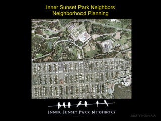 The document outlines a master plan for Inner Sunset Park, focusing on creating a walkable, community-oriented neighborhood with improved access to Golden Gate Park and public transportation. Proposed enhancements include gathering spaces, parklets, sidewalk improvements, and better transit links, along with greening elements like trees and public art. The plan aims to enhance the area's unique character and promote positive community interaction.