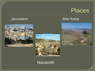 Israel is a country located in the Middle East. Some notable places in Israel include Jerusalem, KferKana, and Nazareth. The culture and religions of Israel were not described in the given document.
