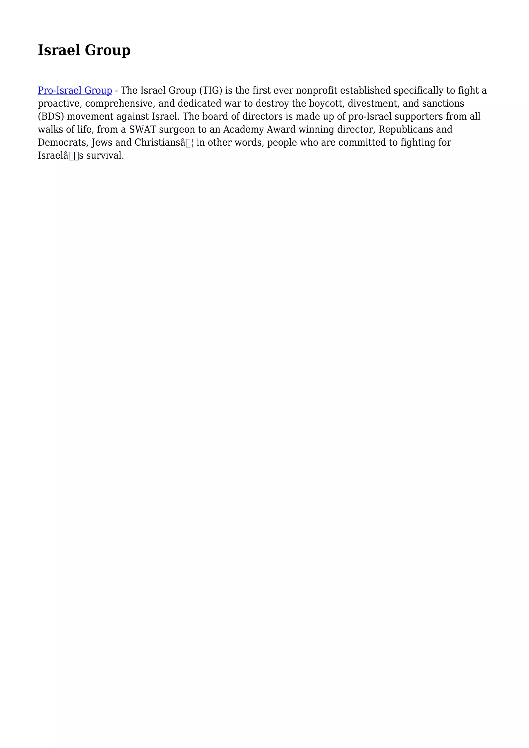 The Israel Group (TIG) is a nonprofit organization established to combat the boycott, divestment, and sanctions (BDS) movement against Israel. Its board consists of diverse members, including notable figures from various backgrounds who are dedicated to supporting Israel's survival. TIG aims to proactively address challenges faced by Israel through a united front.