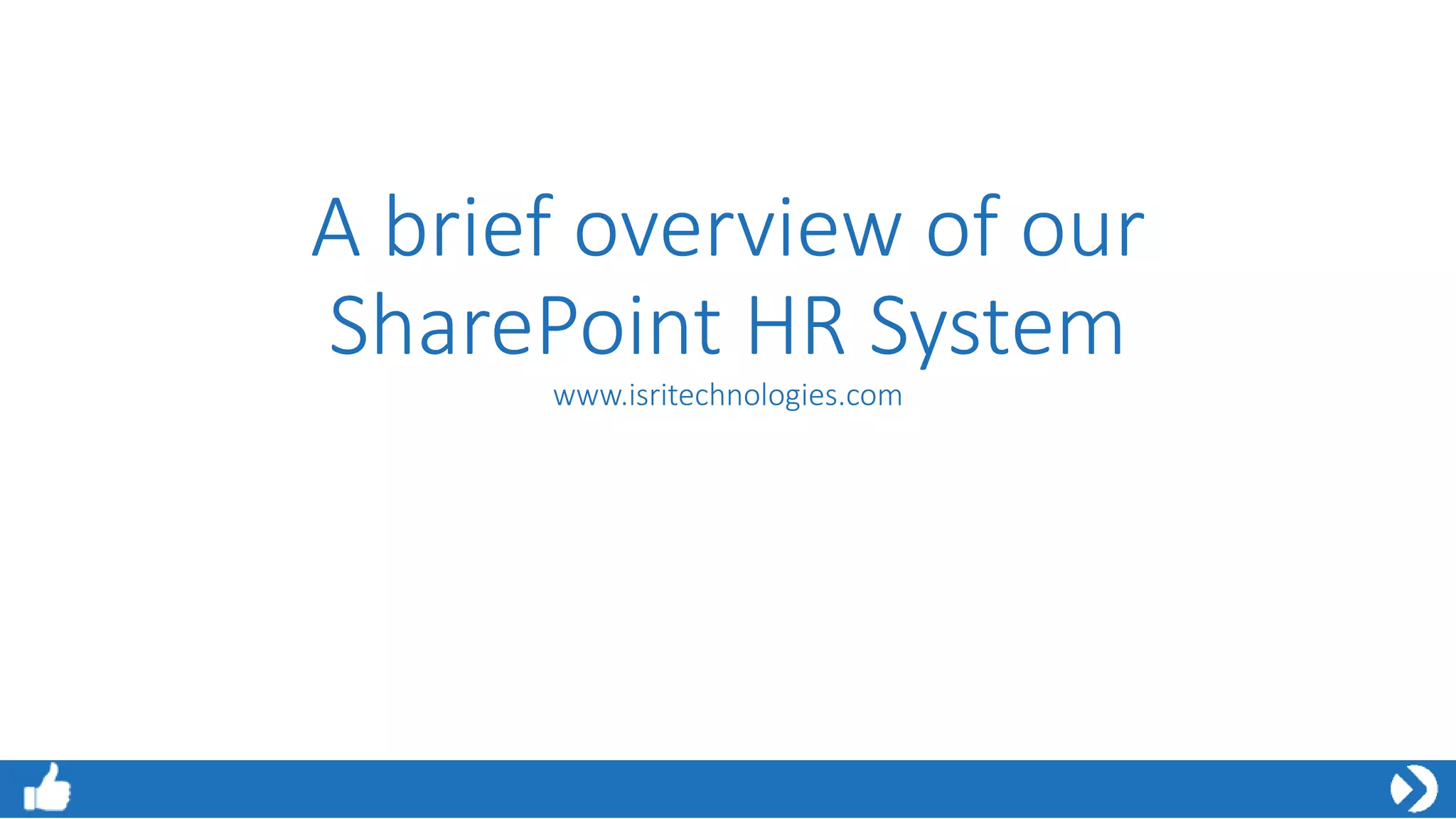 The document provides an overview of the key features and functionality of an HR system built using SharePoint, including the ability for employees to update their records, request and track holiday approvals, log and track leave, conduct performance reviews, and analyze absenteeism and appraisal data. Key features allow for self-service access to HR processes, role-based permissions to update records, automated notifications, and integration with organizational structures and databases.