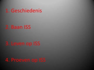 Iss 1. 2. 3. 4. Tot vandaag worden er nog nieuwe delen door verschillende landen toegevoegd.https://cygnus.cc.kuleuven.be/webapps/portal/frameset.jsp?tab=courses&url=/bin/common/course.pl?course_id=_263178_1 5. 6. Baan ISSOp 350 à 400km hoogte aan 28000 km/u in een polaire baan.http://www.ikhebeenvraag.be/vraag/10404 7. 8. Leven op ISS Kleding aanwezig in ISS: later verbrandt in atmosfeer 9. Voedsel: * gevriesdroogd voedsel* Speciale plastic verpakkingen* Gelatine Ontspanning: Hometrainer, lezen, …http://mediatheek.thinkquest.nl/~lld211/article.php?id=25&s=2 10. 11.
