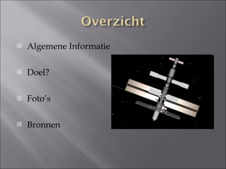ruimtestation dat inbaan om aarde vliegt Betaald door een hele hoop landen Eerste lancering 20 november 1998 november 2000: permanent bewoond - 4.