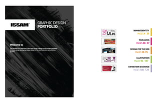 This graphic design portfolio document summarizes 5 years of design work including branding, literature, packaging, web, illustration and exhibition design. It is organized into sections covering each area of design work, and provides examples of projects within each section along with 1-2 paragraph descriptions of the designer's approach and services related to that area. Each project example includes 1-2 pages showcasing design elements and outcomes.