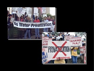 This document discusses whether privatization is the right approach to solve management issues at the public water utility PDAM Tirta Daroy in Banda Aceh, Indonesia. PDAM Tirta Daroy is facing problems like poor management, inadequate services, high operational losses, and large debts. The document analyzes several theories around whether privatization improves efficiency, increases productivity, and generates profits. However, evidence from other countries shows private companies often fail to meet targets, lack transparency, prioritize profits over service, and result in wealth transfers to foreign companies. The conclusion is that privatization has limited benefits for developing countries and failed to equitably distribute power and wealth. Public-public partnerships may be a better solution than privatization