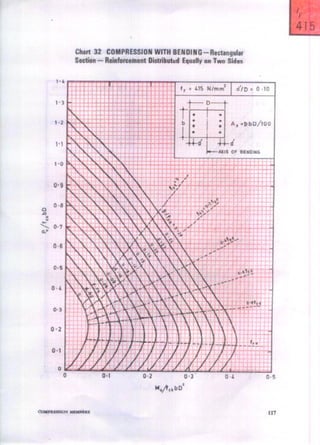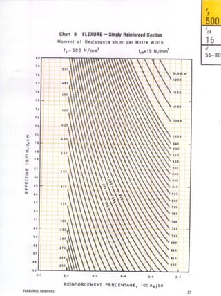 This document provides design aids for reinforced concrete based on Indian Standard IS: 456-1978 (Code of Practice for Plain and Reinforced Concrete). It contains charts and tables to help designers calculate reinforcement requirements and check strength and serviceability limits for beams, slabs, and columns in a more efficient manner compared to manually calculating each clause of the Code. The design aids cover material properties, flexural members, compression members, shear and torsion, development length and anchorage, working stress method, deflection calculation, and general tables. They are intended to supplement, not replace, following the provisions of IS: 456-1978. The formats include explanations, assumptions made, and an example demonstrating use of the aids.
