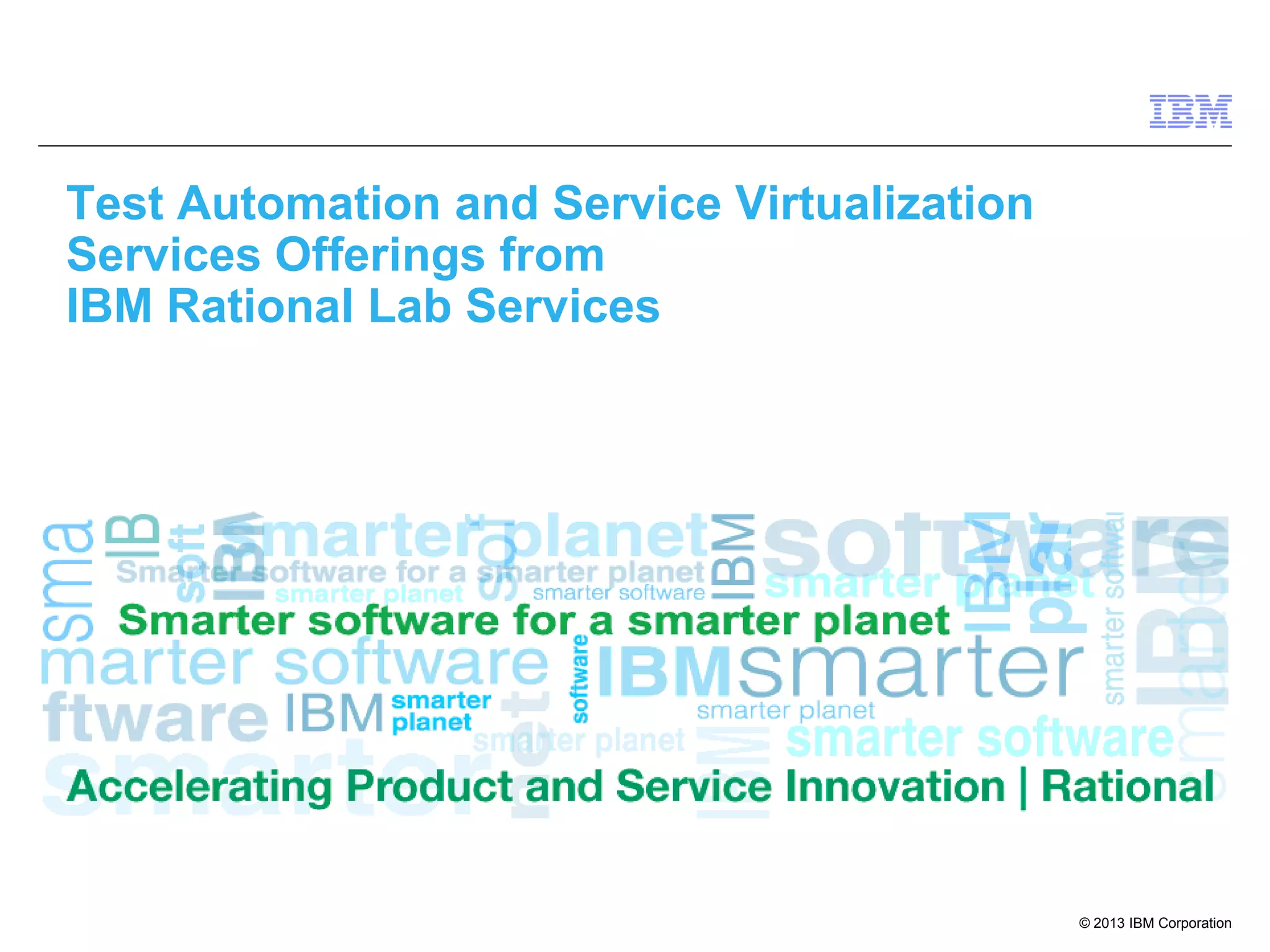 The document provides an overview of IBM Rational Lab Services' test automation and service virtualization offerings. It describes their mission to deploy Rational solutions to improve software development and delivery capabilities. It then discusses the benefits of embracing continuous integration testing and test virtualization. The remainder of the document details IBM's 1-2-3 services delivery approach and specific service offerings for test automation, including assessment and planning, a quick win pilot, consulting services, and ongoing management and support.