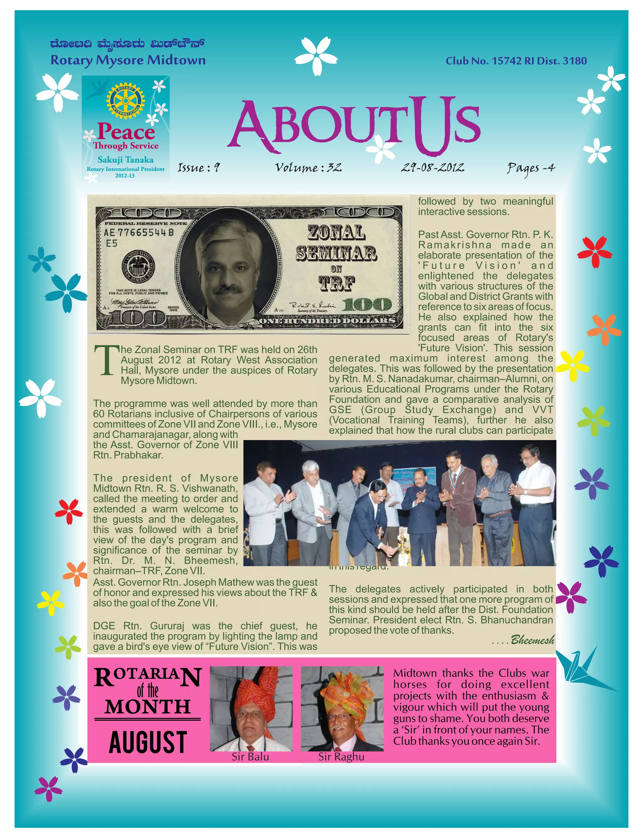 The Zonal Seminar on The Rotary Foundation was held in Mysore on August 26th, 2012. Over 60 Rotarians from Zones VII and VIII attended. Rtn. P.K. Ramakrishna gave a presentation on TRF's Future Vision and the six areas of focus. Rtn. M.S. Nanadakumar presented on TRF's educational programs. The delegates actively participated in discussions and expressed interest in more such programs after the district foundation seminar. The seminar was a success in educating Rotarians on TRF's programs and grants.