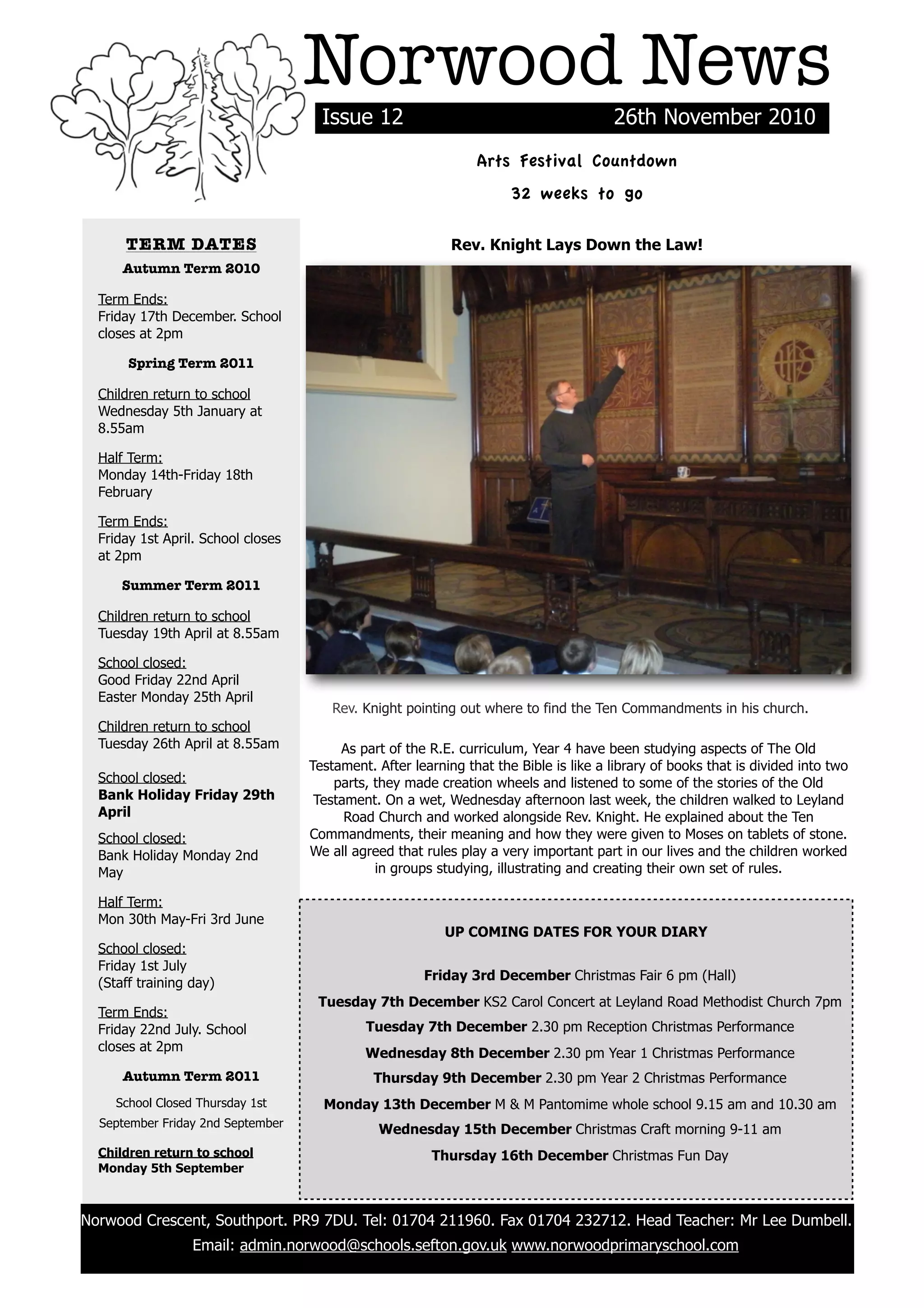 This document provides the term dates and upcoming events for Norwood Primary School in Southport, UK. It lists the term start and end dates for the autumn 2010, spring 2011, and summer 2011 terms. It also announces upcoming school performances and events like the Christmas fair and pantomime. Short articles provide updates on classes visiting the local church to learn about the Ten Commandments and holding competitions related to Thanksgiving and The Chronicles of Narnia. The document closes with recognizing student achievements and announcing temporary changes to school meals due to kitchen renovations.