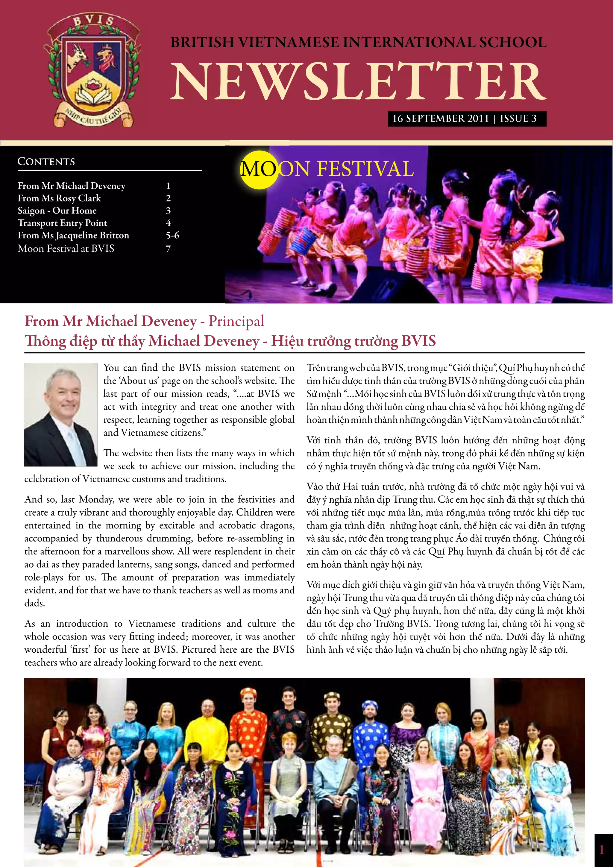 Tài liệu này là thông điệp từ thầy hiệu trưởng Michael Deveney và cô phó hiệu trưởng Rosy Clark về hoạt động và chương trình giảng dạy tại trường BVIS, bao gồm việc tổ chức ngày hội trung thu và các hoạt động học tập cho học sinh. Học sinh được khuyến khích tham gia vào các câu lạc bộ ngoại khóa và có cơ hội cống hiến cho hội học sinh. Sự hào hứng và hợp tác giữa giáo viên, phụ huynh và học sinh là điều quan trọng để phát triển văn hóa và truyền thống Việt Nam.