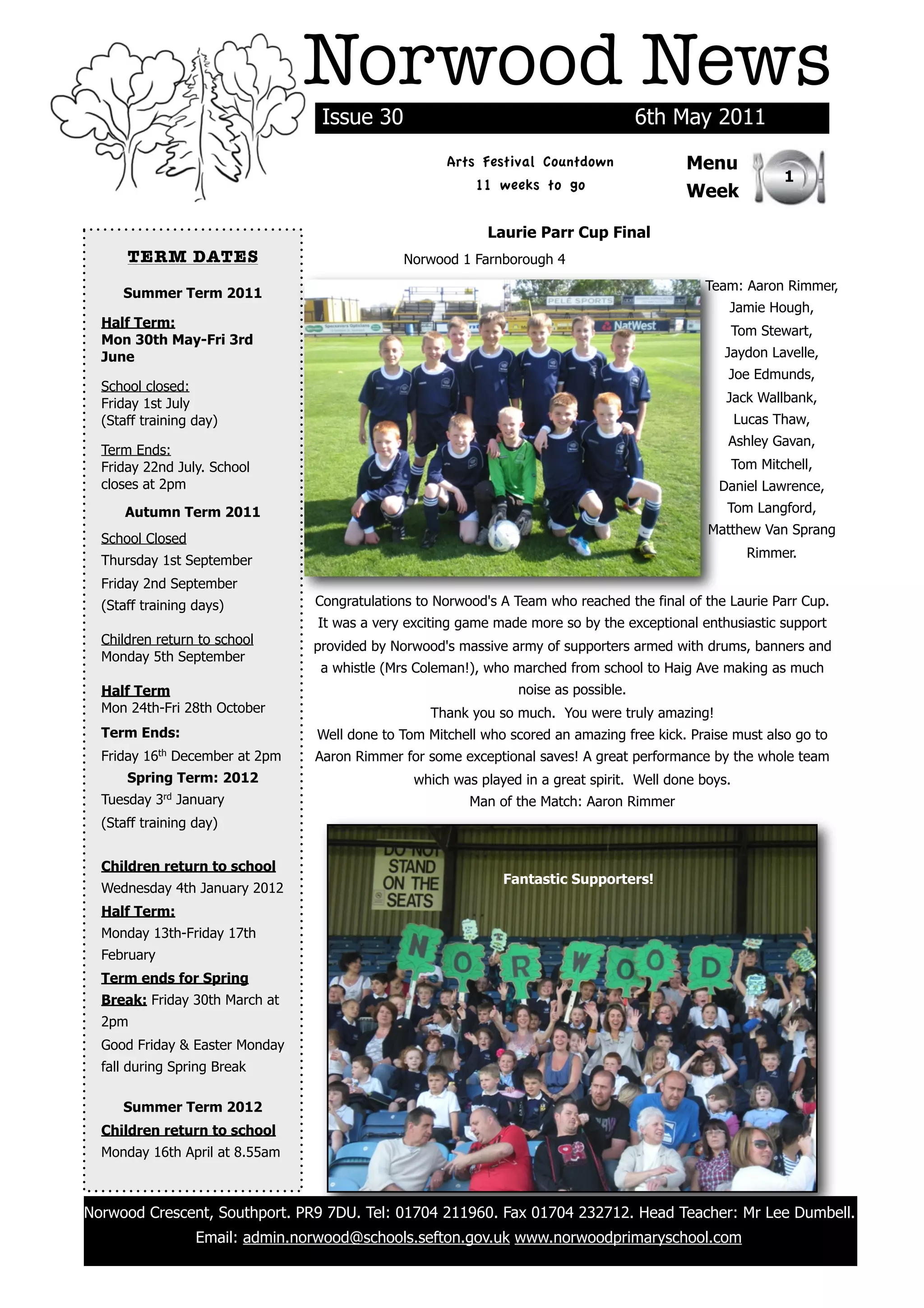 The document is the May 2011 issue of the Norwood News, a school newsletter. It provides information about upcoming events at the school including sports competitions, school trips, and parent meetings. It also celebrates student accomplishments like passing swimming levels and winning archery competitions. Finally, it provides the school term dates and club meeting schedules for the upcoming week.