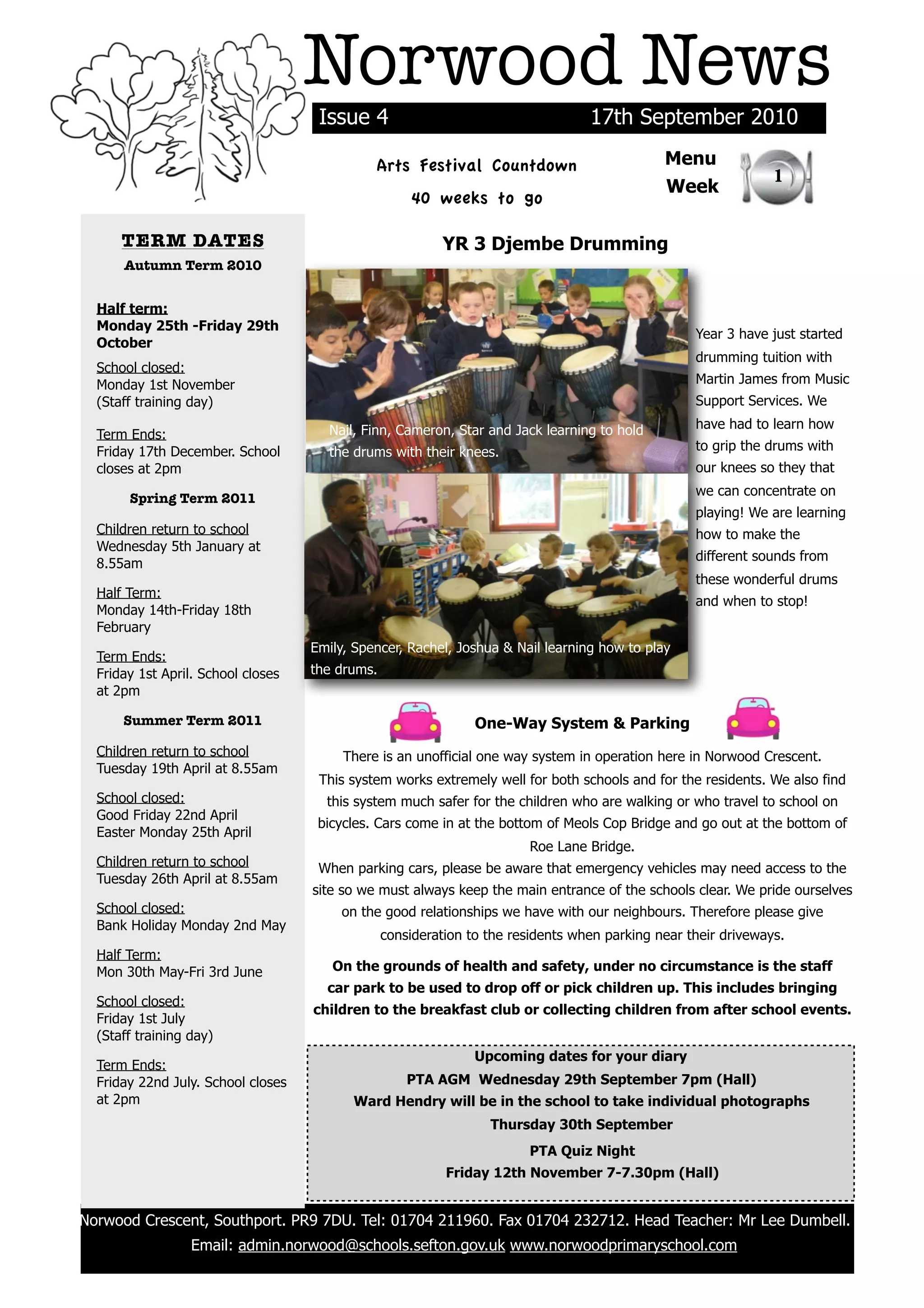 The document is a newsletter from Norwood Primary School. It provides information about upcoming events at the school including an arts festival countdown, term dates, drumming lessons for Year 3 students, parking reminders, and congratulations to students who earned merits on exams and swimming awards. It also announces the winners of the weekly Shinewaves logo design and conker competitions.
