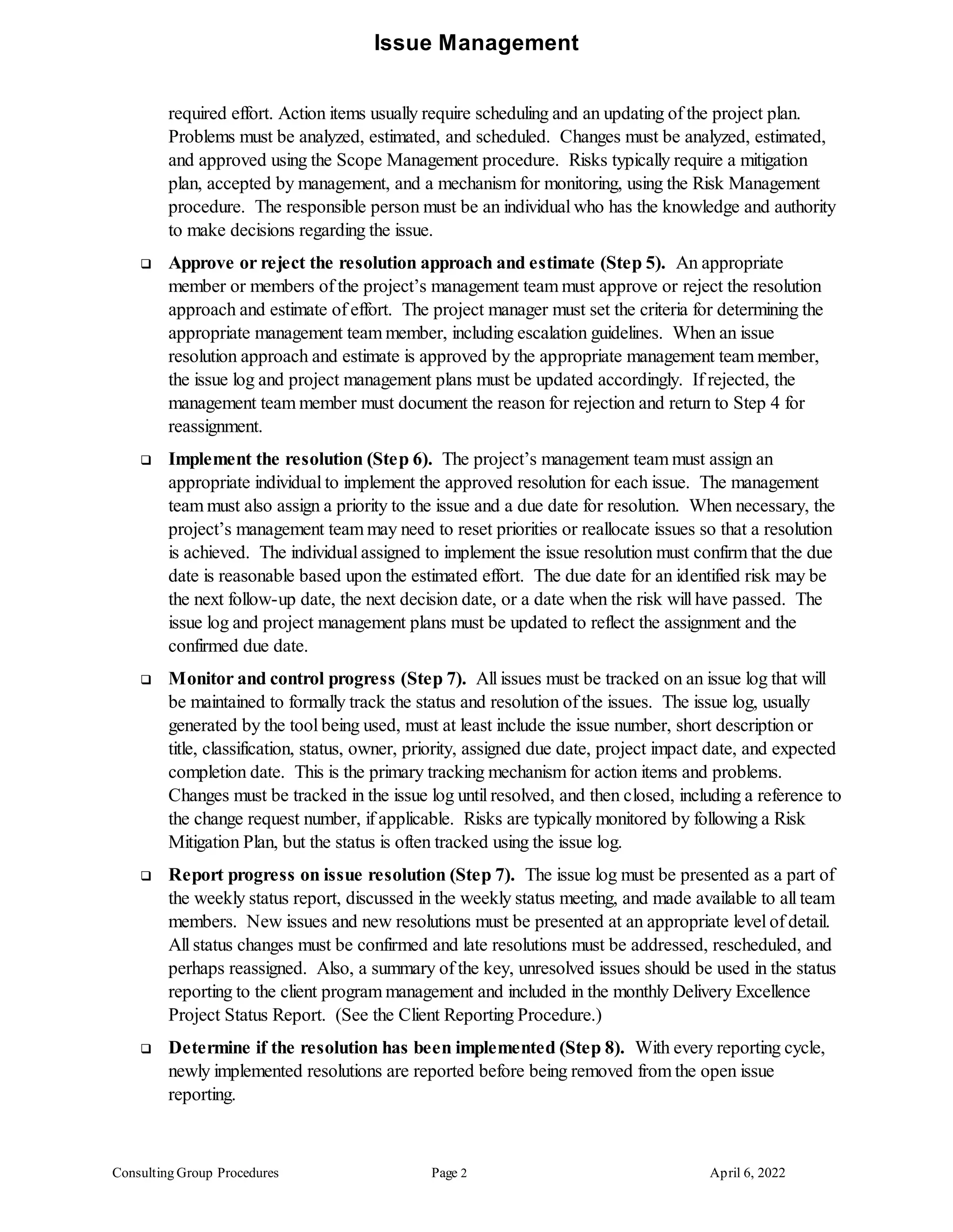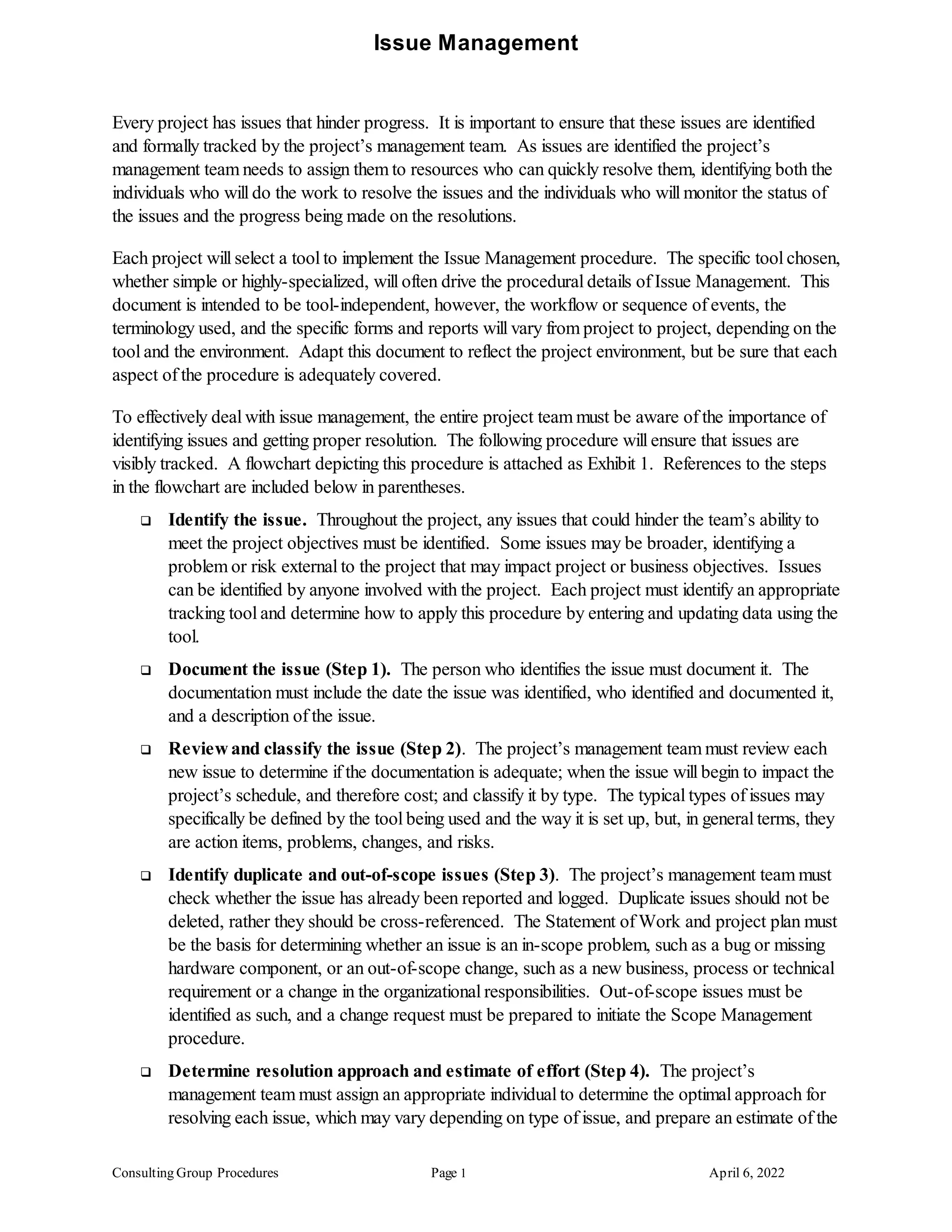 The document outlines procedures for issue management on projects. It states that all projects should have a formal process to identify, track, resolve and report on issues. The procedures involve documenting new issues, reviewing them, determining resolution approaches, monitoring progress, and communicating resolutions. A flowchart is provided to depict the 9 step process which includes identifying issues, documenting them, reviewing, assigning resolution owners, approving approaches, implementing resolutions, monitoring progress, reporting, and closing issues once complete.