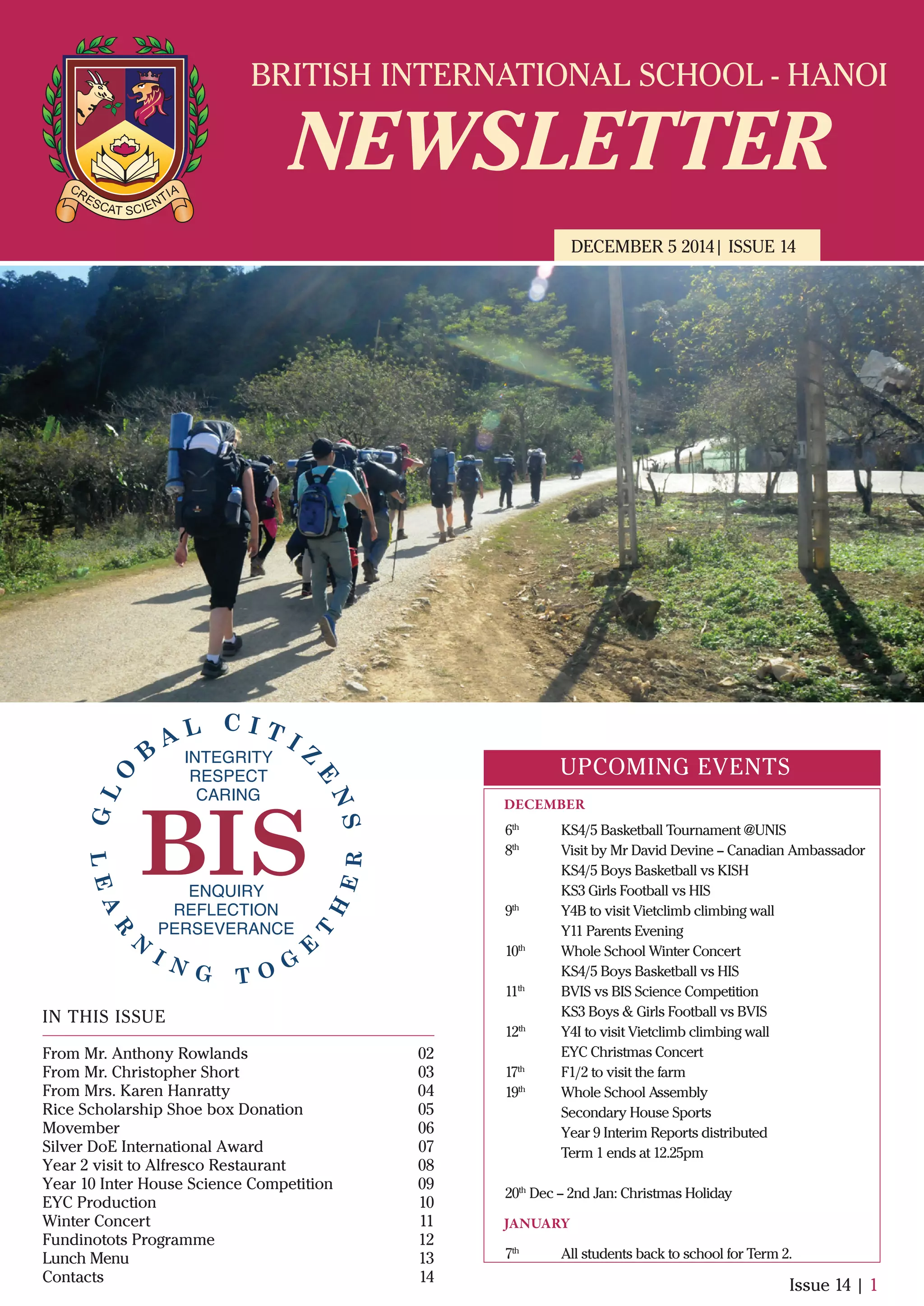 The newsletter from the British International School in Hanoi provides updates on various school events from the past week. It discusses (1) students volunteering their time to host underprivileged children from a local charity and participating in a hiking trip for the Duke of Edinburgh award, (2) upcoming academic and sporting events, and (3) fundraising efforts for charity including growing mustaches for Movember and collecting donated shoeboxes.