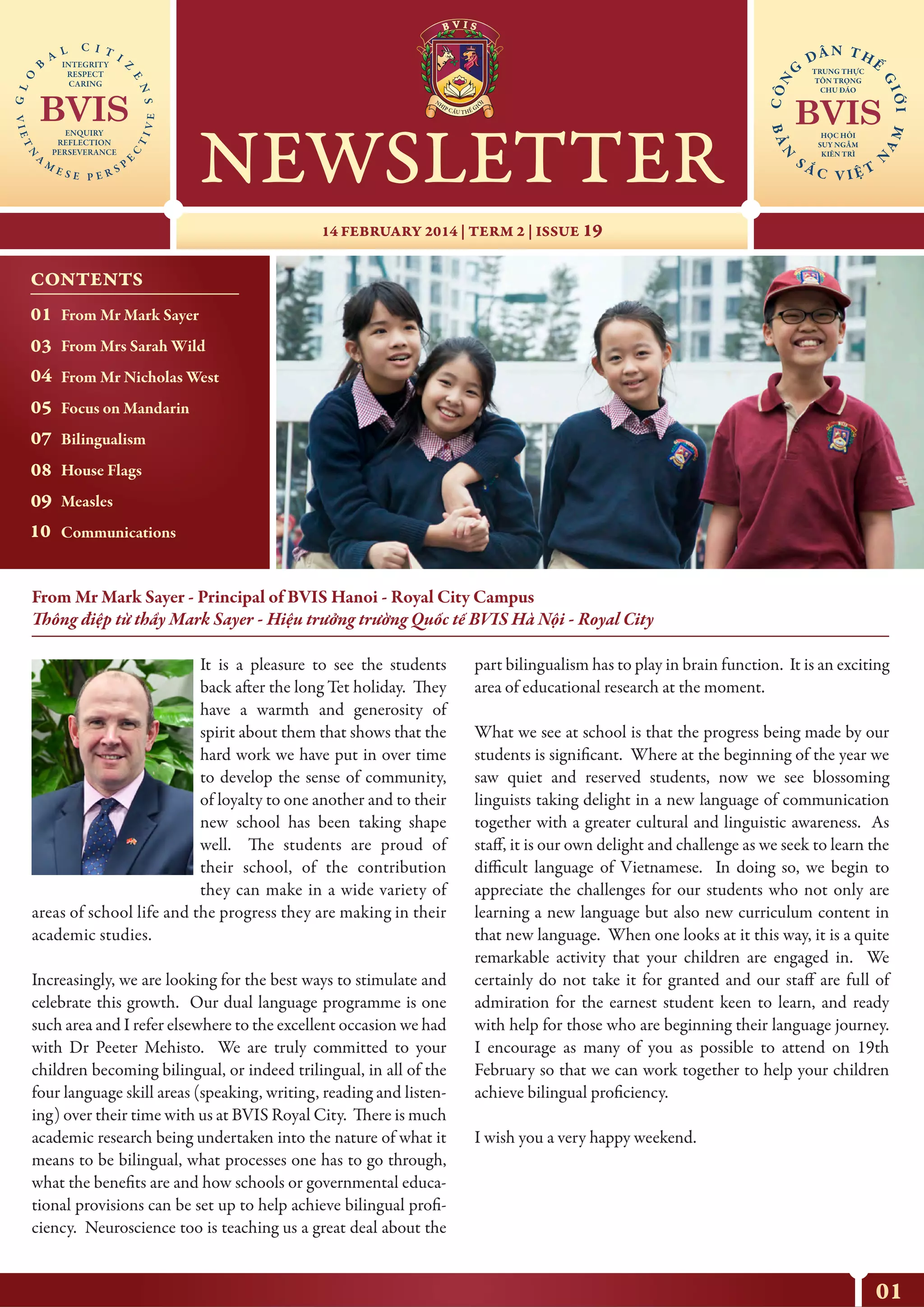 Hiệu trưởng Mark Sayer nhấn mạnh sự trở lại của học sinh sau kỳ nghỉ Tết, đồng thời khen ngợi tinh thần cộng đồng và sự phát triển ngôn ngữ của các em. Trường cam kết phát triển chương trình song ngữ và tìm kiếm các cách thức kích thích sự phát triển này. Các giáo viên đang nghiên cứu về song ngữ và học hỏi từ những khó khăn của học sinh trong việc học ngôn ngữ mới, với nhiều sự kiện và cuộc thi sắp tới để khuyến khích học sinh tham gia.