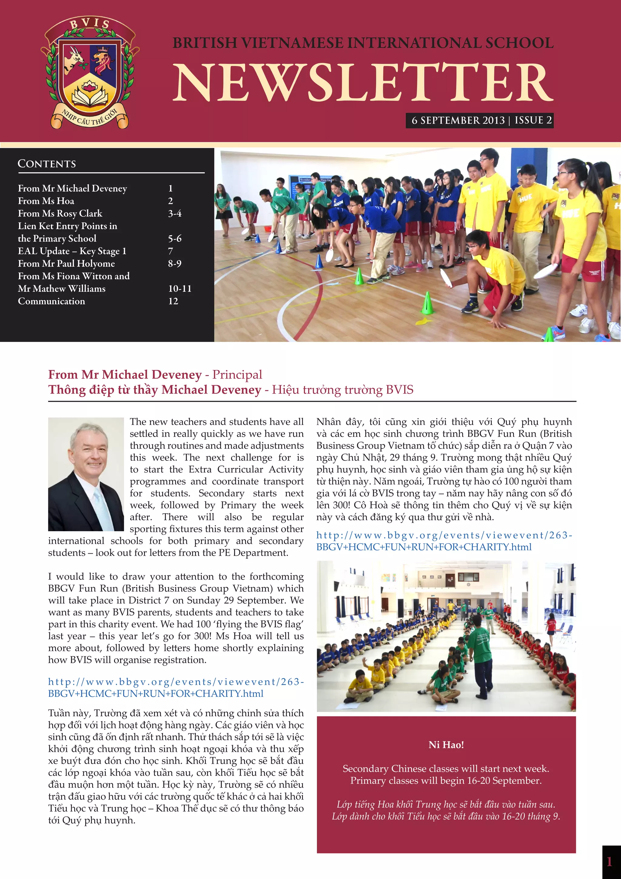 Thầy Michael Deveney thông báo về việc các giáo viên và học sinh tại trường BVIS đã ổn định nhanh chóng và chuẩn bị cho các chương trình ngoại khóa, với các hoạt động thể thao và cuộc chạy gây quỹ từ thiện sắp tới vào ngày 29 tháng 9. Cuộc chạy này sẽ hỗ trợ nhiều dự án phát triển ở Việt Nam, và trường mong muốn thu hút nhiều phụ huynh, học sinh và giáo viên tham gia. Bên cạnh đó, các lớp học tiếng Trung cho khối trung học sẽ bắt đầu vào tuần sau.