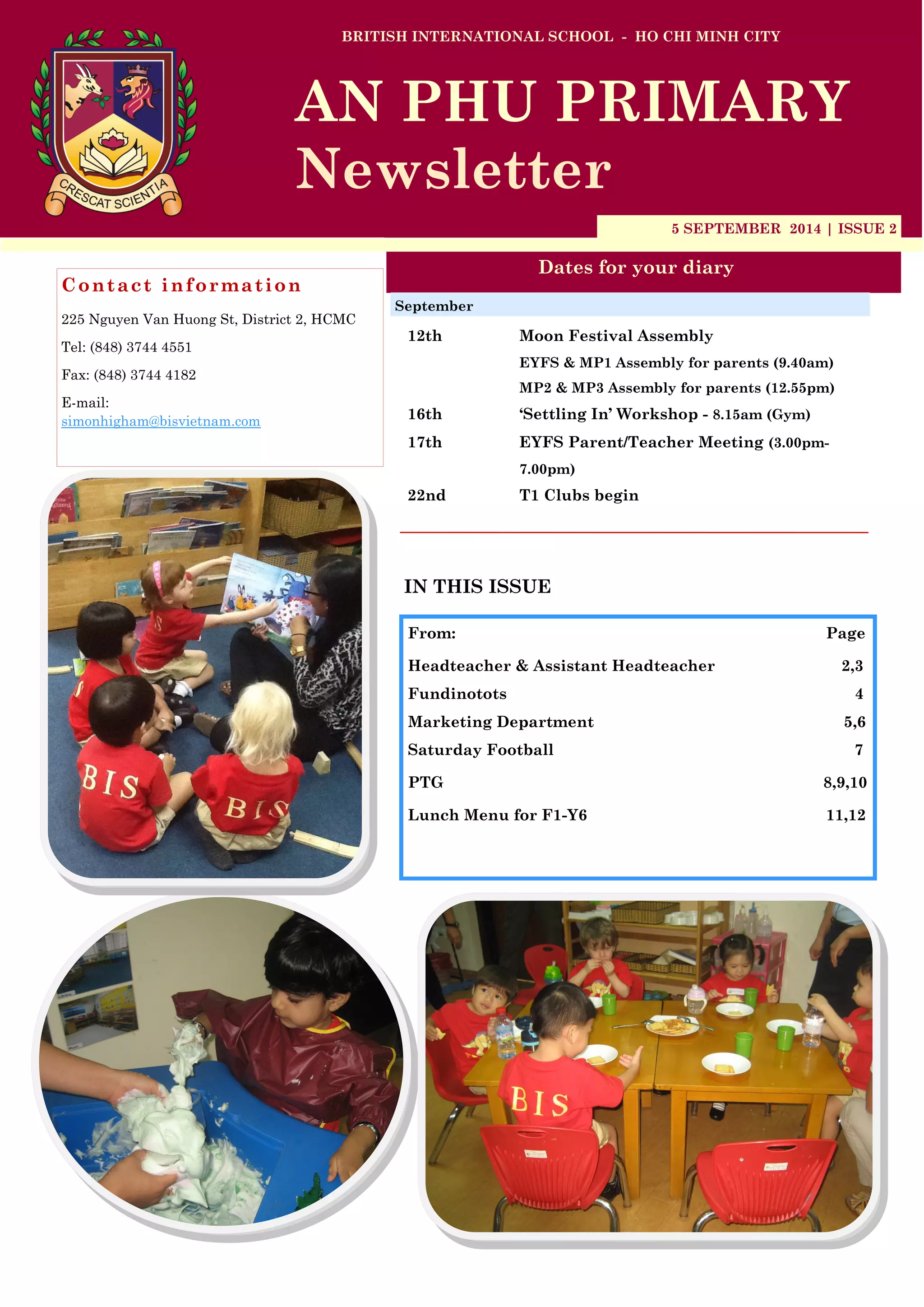 This newsletter from the British International School - Ho Chi Minh City provides information about upcoming events in September. It includes: