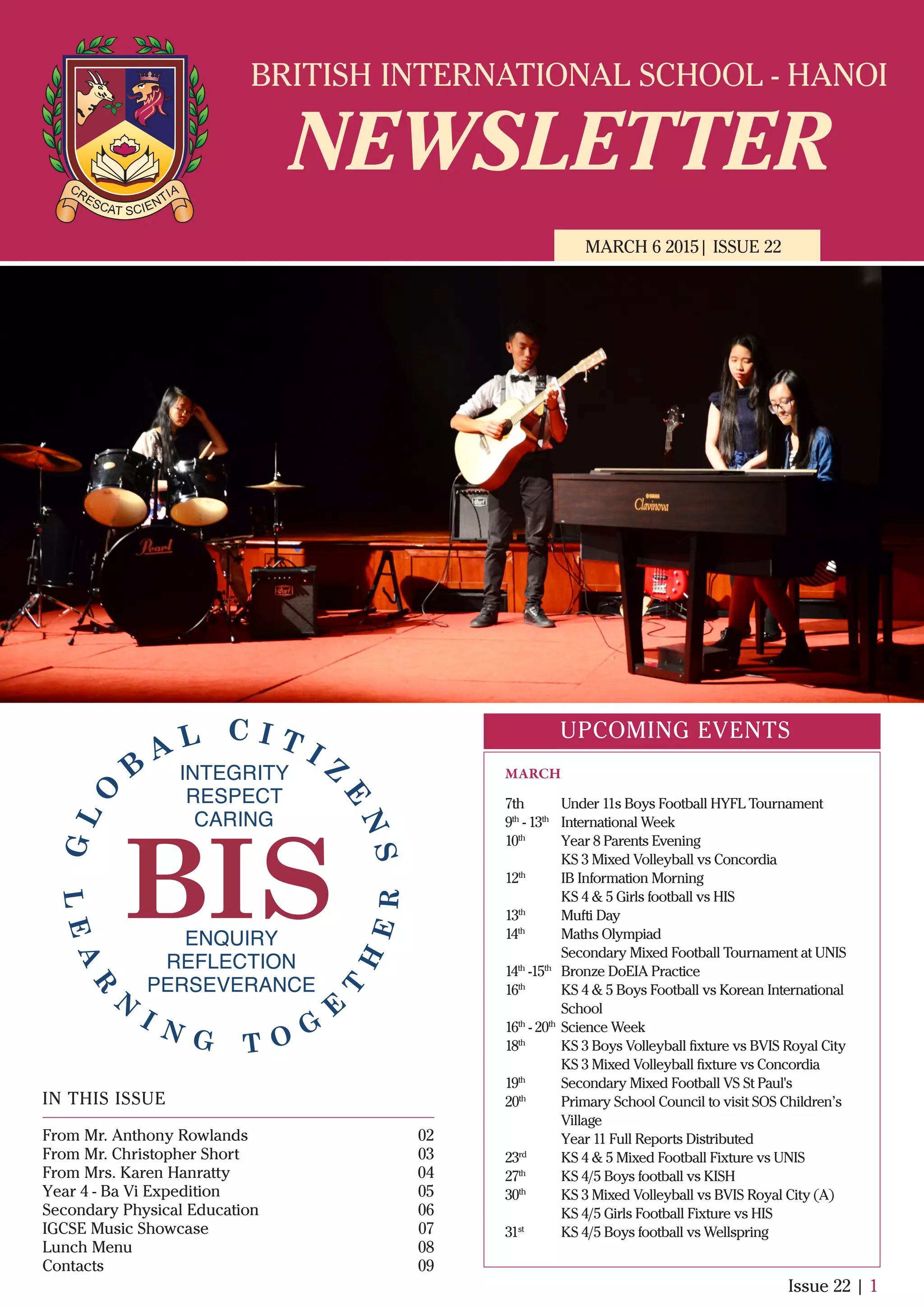 The newsletter from the British International School in Hanoi provides information on upcoming events in March, including International Week, Year 8 Parent's Evening, various sporting fixtures and tournaments, and Science Week. It also includes articles from the Principal, Head of Secondary, and Head of Primary discussing the benefits of students becoming global citizens through travel and the school's partnerships, as well as recapping recent events like the Year 4 expedition and IGCSE Music Showcase.