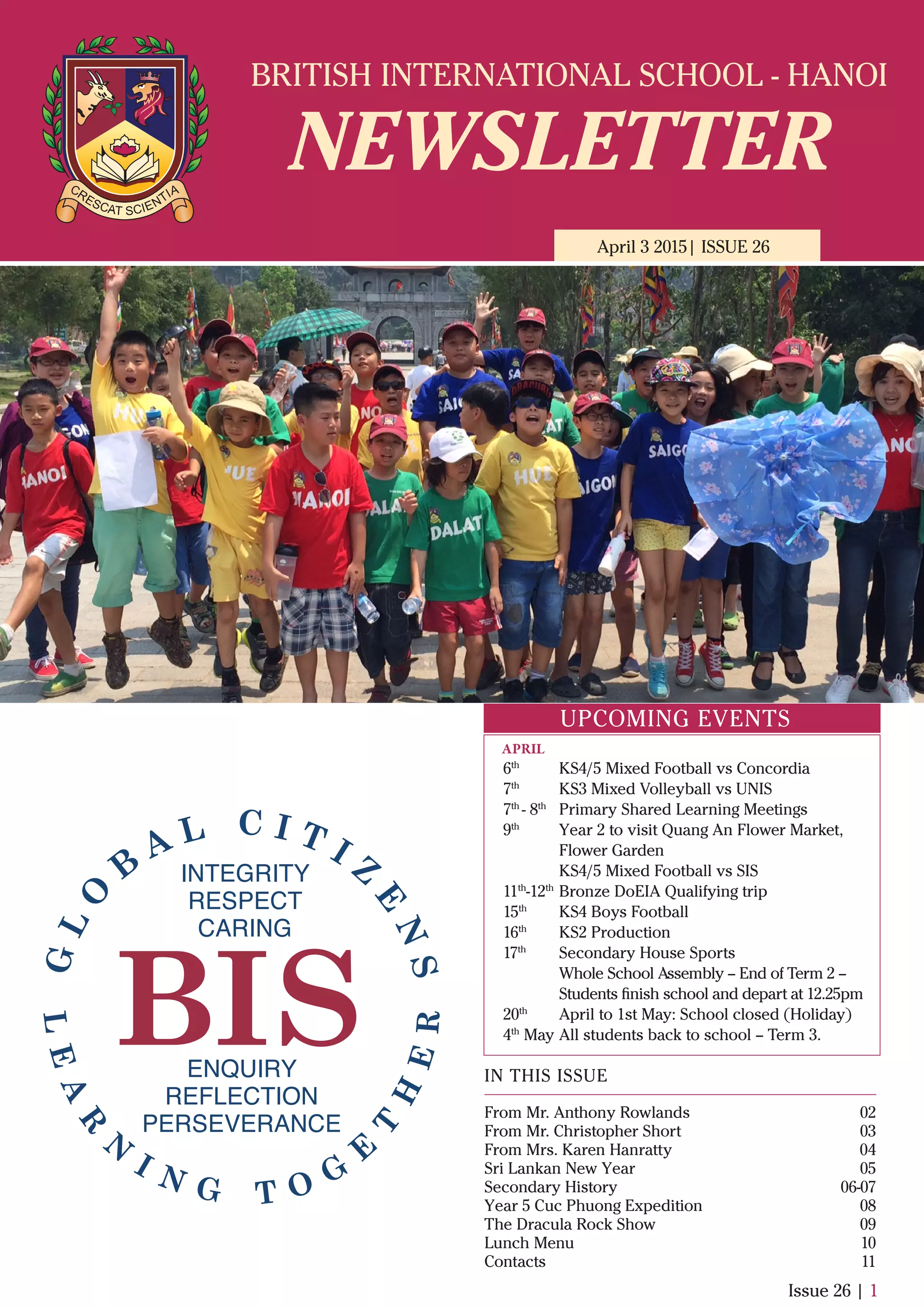 The newsletter provides information on upcoming events at the British International School in Hanoi, including sports competitions, school trips, and performances. It also includes messages from the Principal and heads of Primary and Secondary discussing preparations for exams and emphasizing the importance of a holistic education.