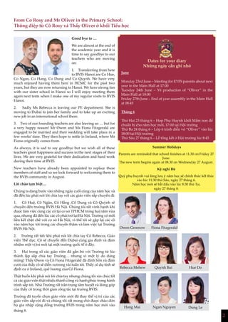 Trường bvis vừa tiếp đón hai chuyên gia giáo dục hai ngôn ngữ, thầy Peeter Mehisto và Fred Genesee, để thực hiện một cuộc 'đánh giá song ngữ' nhằm xác định điểm mạnh và các lĩnh vực cần cải thiện trong việc giảng dạy tiếng Anh và tiếng Việt. Kết quả đánh giá cho thấy trường đã phát triển vượt bậc và nhận được phản hồi tích cực từ các chuyên gia, cùng nhiều đề xuất để cải tiến thêm. Ngoài ra, năm học sắp kết thúc với một số sự kiện quan trọng và các giáo viên sẽ chuyển đi, cũng như thông báo về thời gian nghỉ hè.