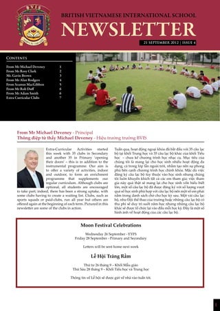 Hoạt động ngoại khóa tại trường bắt đầu với 35 câu lạc bộ tại khối trung học và 35 câu lạc bộ tại khối tiểu học nhằm nâng cao chương trình học cho học sinh. Học sinh được khuyến khích tham gia, và một số câu lạc bộ đã có danh sách chờ do nhu cầu cao. Sự kiện lễ hội trăng rằm sẽ diễn ra vào ngày 26 và 28 tháng 9 với sự tham gia của phụ huynh và học sinh.