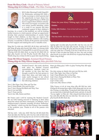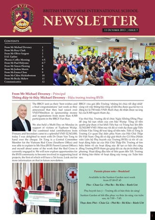 Thầy Michael Deveney thông báo rằng BBGV đã quyên góp được hơn 750 triệu VNĐ từ 8,500 người tham gia cho buổi chạy từ thiện và trường đã tổ chức ngày không đồng phục để ủng hộ nạn nhân bão Wutip, thu được 32,543,000 VNĐ. Cũng trong tuần, trường tổ chức buổi cà phê sáng cho phụ huynh để giới thiệu về chương trình dạy ngữ âm tiếng Anh và bầu cử đại diện hội học sinh. Các học sinh lớp 12 và 13 đã khởi động hoạt động từ thiện đầu tiên cho trường khiếm thị Nguyễn Đình Chiểu.