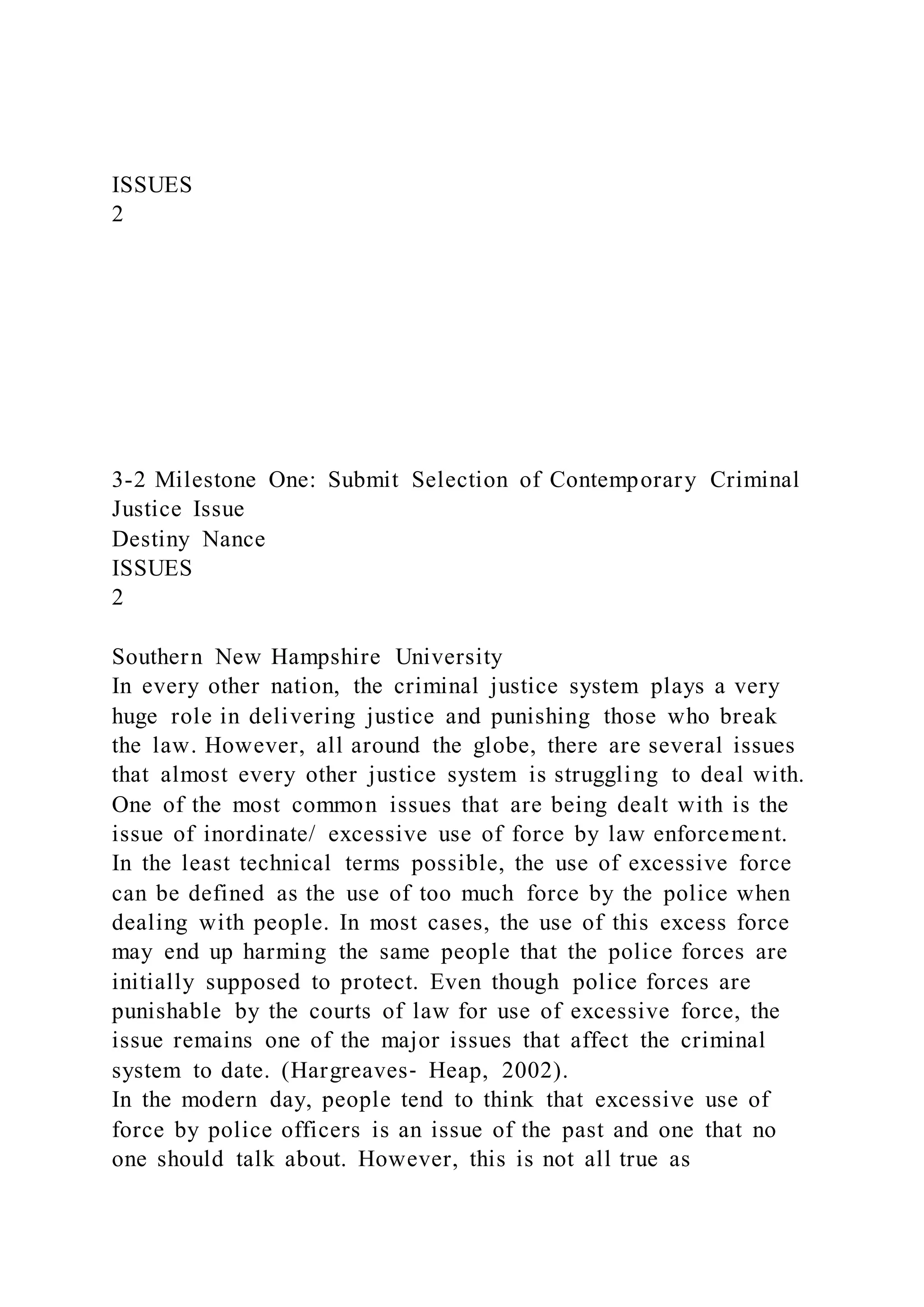 The document discusses the pervasive issue of excessive use of force by law enforcement within the criminal justice system, emphasizing its historical evolution and contemporary relevance. It highlights the impact of technology, particularly body cameras, in shedding light on police brutality and mentions significant events, such as the death of George Floyd, that sparked widespread protests. Additionally, the document outlines the requirements for an in-depth analysis of this issue, including the identification of contributing factors, effects on the justice system and public, and strategies for change.